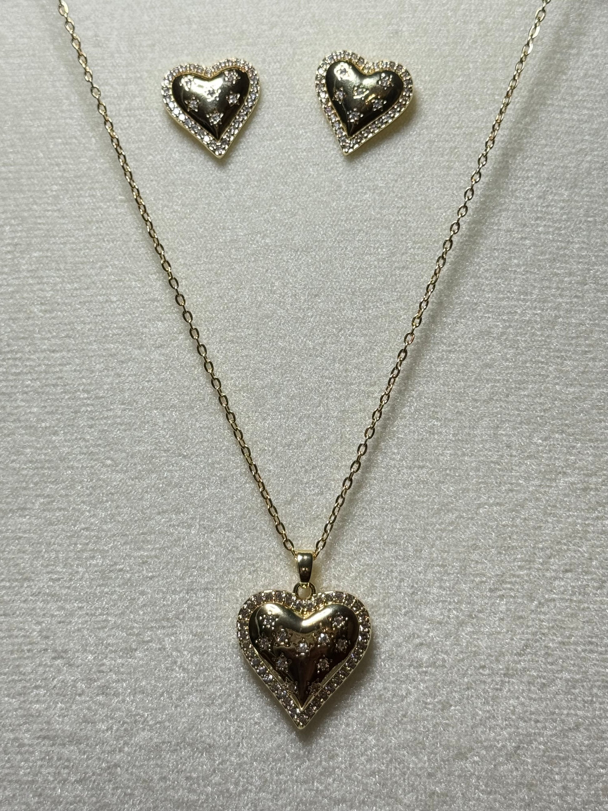Add a touch of romance and timeless beauty to your style with this stunning 14K gold filled jewelry set. Featuring a delicate necklace and matching stud earrings, each piece is designed with a polished heart at the center, surrounded by sparkling stones that catch the light with every movement.