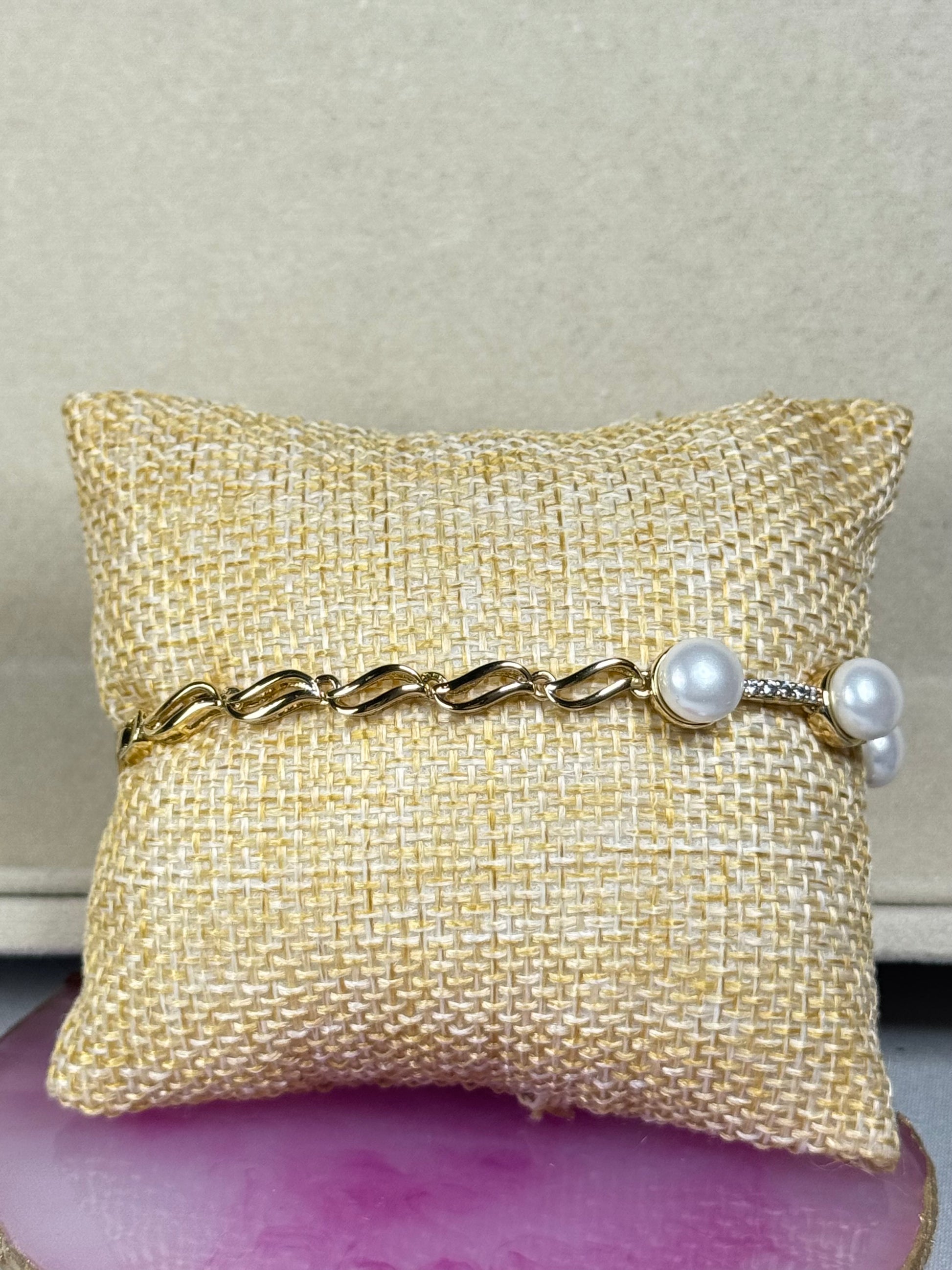 This bracelet has an elegant and contemporary design — a chain of 14K gold-plated twisted links paired with white pearls at the ends and a touch of sparkling cubic cristal.
