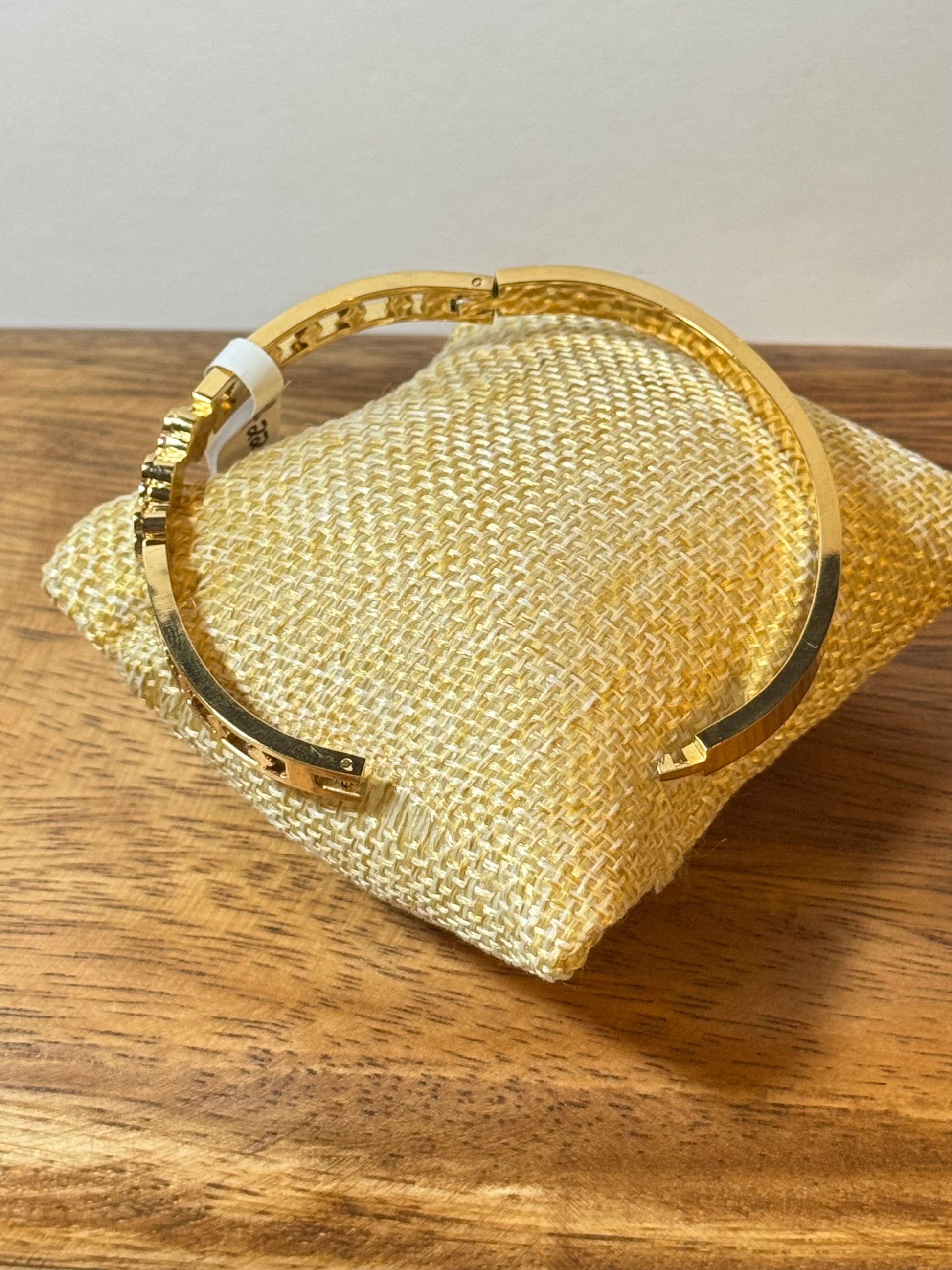 A chic statement piece, this bangle is crafted in radiant gold-tone stainless steel and adorned with delicate clover motifs in black and mother-of-pearl accents. Its design symbolizes elegance, making it the perfect bracelet to wear alone or stacked for a modern layered look.